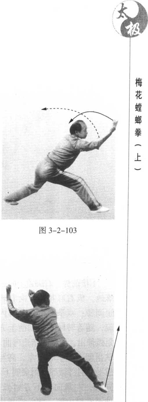 2.向左转腰拧胯调膀; 右拳外旋,随着转腰向前 上方崩出,腕向拳心边弯 曲,拳面朝上,拳心朝后, 高与头平,肘部微屈,肘 尖朝下;同时,左拳屈肘 收至右肘下方,拳面朝右, 拳心朝下,肘尖朝左下方; 目视右拳(图3-2-103 )o