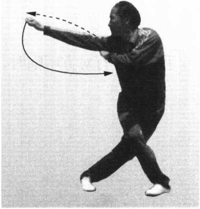 2 .向右转腰调膀;左拳变掌内旋,随着转腰调膀,从右臂 下方向右、向前、向上方划弧变钩,钩尖朝左,比头稍高;右拳 外旋转,屈肘向左、向后、向下、向右方划弧,摆动至腰间抱 拳,拳面朝左,拳心朝上,肘尖朝右;目视前方(图4—13)。