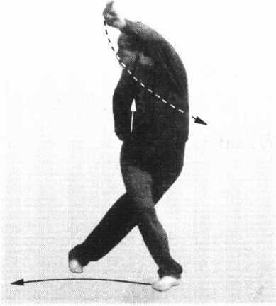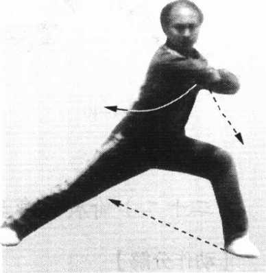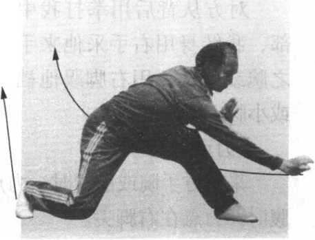 接前招。如对方被我用“斜身盘肘”打倒,躺着用脚踢我 裆或腹部,我速提左脚向后闪身,用左掌招出来脚,然后上左 步,用右拳打他头部。