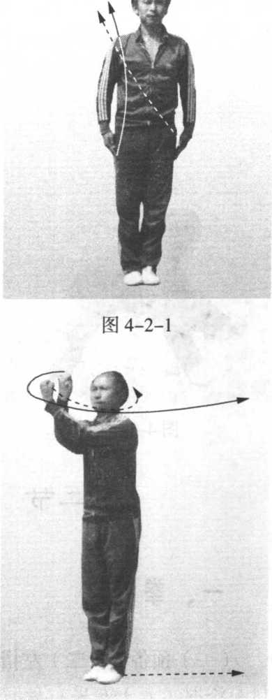1 图 4-2-2图 4-2-2.接前势。向右转腰调 膀;双掌变拳,各自外旋, 双肘弯曲80。,两前臂在身前 竖起,于腕处交叉,右前臂 在里,双拳面朝上,拳心朝 后,高与头平,双肘尖朝下; 目视右拳