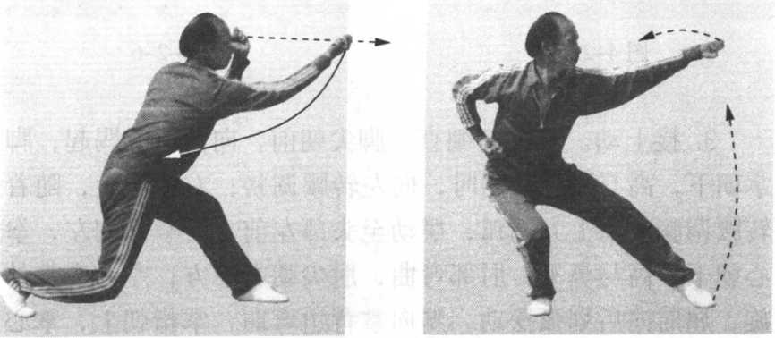 我用左手招出来手,用左脚 踢他的裆或腹部。如果对方 逃出我左脚,我再起右脚踢 他同一部位,同时,用右拳 圈打他头部。