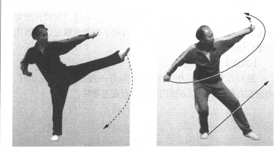 3.接上动。右脚面绷直,脚尖朝前,向前上方踢起,脚 掌朝下,高与腹平,同时,向左转腰调膀;右拳内旋,随着 转腰调膀向前上方划弧,摆动至头部左前方,拳面朝左,拳 心朝下,高与鼻平,肘部弯曲,肘尖朝右下方;左钩变掌外 旋,屈肘向后划弧摆动,腕向掌背边弯曲,掌指朝上,掌心 贴靠在右前臂拇指一边,肘尖朝左下方,高与胸平;目视前