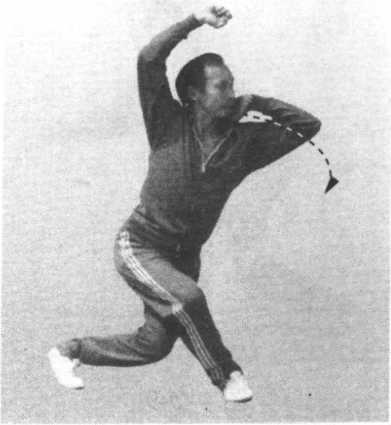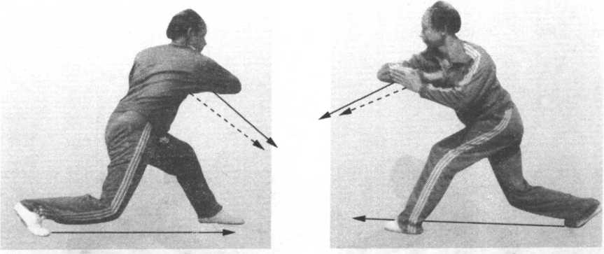 梅 花 螳 螂 拳上梅 花 螳 螂 拳上朝后;左掌腕向掌背边弯曲,掌指朝上,掌心贴靠着右前臂内侧, 和右拳同时向前下方摆动,高与膝平;目视右拳(图展2-12)。