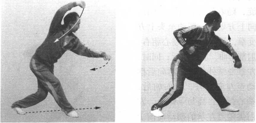 接前招。如果对方逃出我“左采右盘肘”,我速上右步, 用右拳击打他下部。