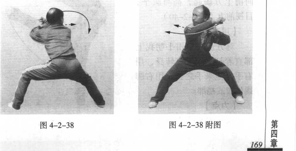 左方,拳面朝左,拳心朝下,高与耳平,肘尖朝右前方;同 时,左钩变掌外旋,屈肘向右下方划弧摆动,腕向掌背边弯 曲,掌指朝上,掌心贴靠在右前臂拇指一边;头向右转,目视 右方(图4-2-38、图4-2-38附图)o