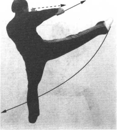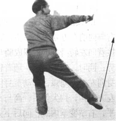 点在右手五指。踢对方腹或裆部时,力点在右脚尖。