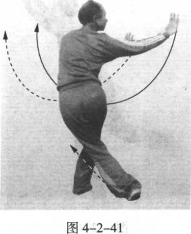 1 .接前势。右脚盖步向后落地,成右麻花步;右钩变掌 外旋,向左前方摆动至身前,腕向拇指边弯曲,掌指朝上,掌 心朝左,高与头平,肘部微屈,肘尖朝下;同时,左掌向前方 伸至右肘内侧,腕向拇指边弯曲,掌指朝上,掌心朝右,肘部 弯曲,肘尖朝下;目视右掌(图4-2-41 )。