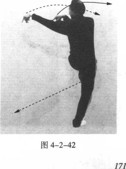 2 .接上动。向左转腰拧胯调膀;双掌各自内旋,随着转 腰向下、向后、向上方划弧,摆动至身后变钩,双钩尖朝下, 左钩在前,高与耳平;右钩位于左肘内侧;同时,左脚提起, 位于右膝内前侧,脚尖朝下,脚掌朝后;头随着手的摆动向左 转,目视左钩(图4-2-42)。