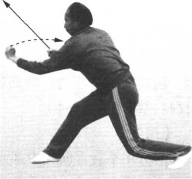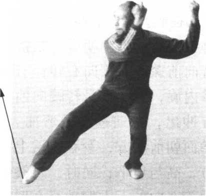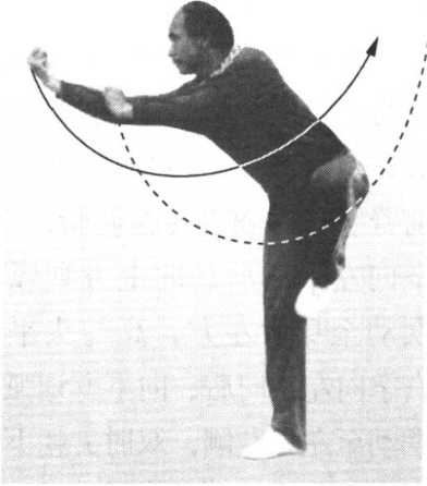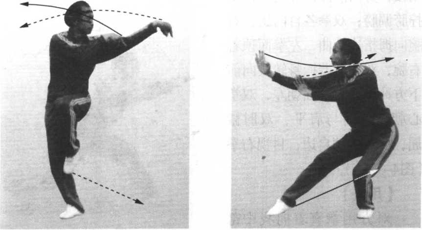 接前势。右脚震脚落地, 左脚提起,位于右膝内前侧, 脚尖朝下,脚掌朝后,紧接 着向前探身,腰向右转;右 拳内旋,随着探身转腰向前 方冲出,腕向拳心边弯曲, 拳面朝前上方,拳心朝后上 方,高与肩平;同时,左拳 内旋,向前下方摆动至右肘 内侧,拳面朝前,拳心贴靠 在右肘内侧,肘部弯曲,肘 尖朝左下方;目视右拳(图