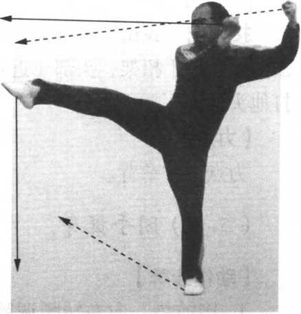 2 .接上动。身向后侧, 同时,右脚面朝上绷直,脚 尖朝前,随着侧身向前上方 踢起,高与腹平;目视右脚 (图4-3-58 )o