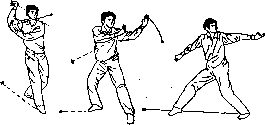(1)接前式,右脚向右后方退半步,紧接着向左转腰拧胯调 膀。左掌内旋转,随着转腰调膀向左一下一后方划弧摆动到身 254