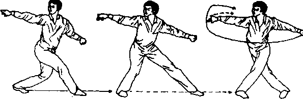 (3) 接上动,右脚倒插步,腿变左麻花步。目视右钩。(图