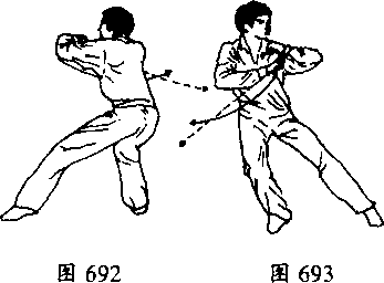 (2) 接上动,左脚向左跨一步。目视右钩。(图690)