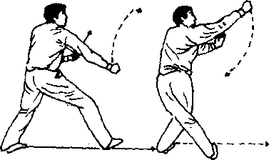 (4) 接上动,左脚倒插向前上一步,紧接着向右转腰调膀。 右拳随着转腰调膀直臂向左一上一右方划弧摆动到身前右方, 拳面朝前,拳心朝左,高与头平。目视右拳。(图697)
