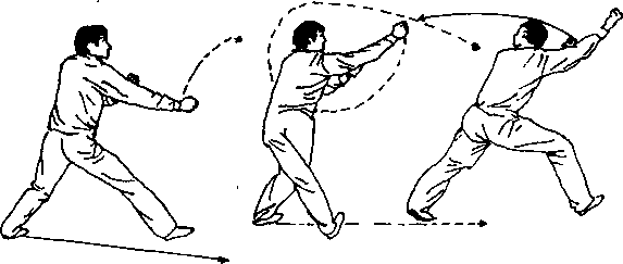 用此招追赶击打敌方,如他起脚,我向外挂他的脚。如他出 手,我向外挂他的手。如他手脚不出,我击打他上部和下部。当 他招架不及失去中心之时,我上右步用右拳打他面门。