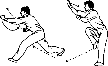 (2)接上动,起身 向左转腰拧胯调膀, 紧接着右脚提起,位 于左膝前右侧,脚尖 朝下,脚掌朝后,成左 锦鸡独立式;右拳外 旋转,随着转腰调膀 向前上方冲出,腕向