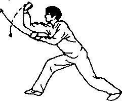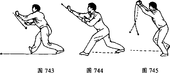 高;同时,左拳屈肘向后下方划弧,收到右腋下,拳面朝右,拳心 朝下,肘尖朝左下方。目视右拳。(图741)