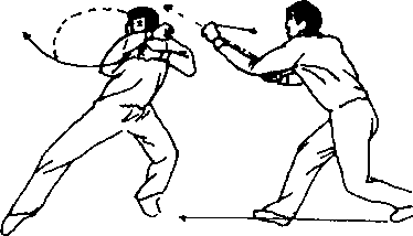 接前招,我用“粘拿穿喉(嗓)”击打敌方的咽喉,如他抬手招 架,我左手趁机从右臂下方向左采他招架之手的腕或小臂,然后 速上左步,用左脚扣住他的脚,用右拳击打他左肋。
