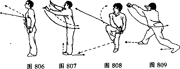(3) 右脚向前进一步落地,腿变右麒麟步。向右转腰拧胯调 膀,右掌内旋转,随着转腰调膀屈肘向前一上一右方划弧摆动到 身前右侧变钩,钩尖朝右,高与耳平,肘尖朝后右方;同时,左掌 变钩,内旋转,向前上方冲出,钩尖朝左,高与头平。目视左钩。 (图 809)