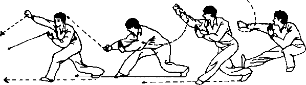 接前招,我用“隔肘伏地下”击打敌方的下部,他必然退步或 猫腰闪躲,此时上部必露破绽,我趁机进步用右拳打他下须,如 他抬手招架或闪躲,下部必露破绽,我进步反右拳打他胁或腹 部。如他吸腰闪躲或用手招架,头部必然近我,我速反右手用掌 打他头部。