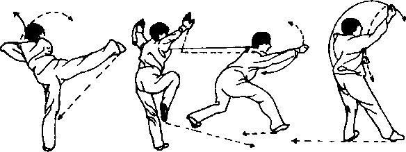 采敌方的来手之腕或小臂时,力点在左手五指,圈打敌方头 部时,力点在右拳轮。踢敌方肋部时,力点在右脚外沿小指一 边。