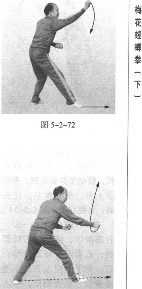 花步;右拳随着转腰调膀,直臂向左、向下、向右、向上方划 弧,摆动至身前右侧,拳面朝上,拳心朝左,比头稍高;目视 右拳(图5-2-76 )o