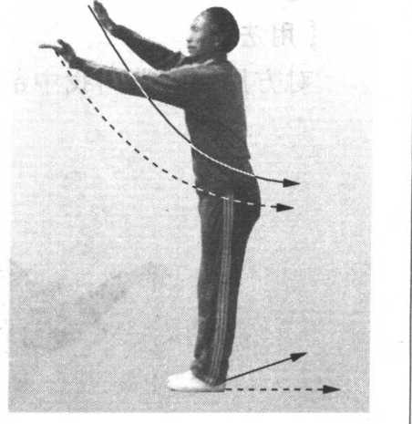 身左侧,右掌位于左掌上方,腕向掌背边弯曲,掌指朝左, 掌心朝下,高与胯平,肘部微屈,肘尖朝右前方;左掌腕向 掌心边弯曲,掌指朝前,双掌心相对,比胯稍低,肘部微 屈,肘尖朝后;目视前方(图 6— 1 —3 )o