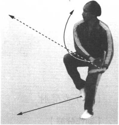 2 .左脚向后退一步,屈 膝半蹲,右脚提起,位于左 膝内侧,脚尖朝下,脚掌朝 后,膝尖朝前,腿成左锦鸡独立势;同时,向左转腰拧胯调 膀,双掌随着转腰调膀,向后、向下、向左方划弧,摆动至