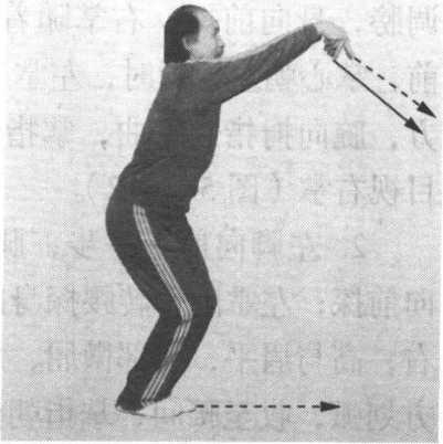钩,钩尖朝左前方,高与眉平,肘尖朝下;右掌外旋,屈肘向 左下方划弧,摆动至左肘内侧变钩,钩尖朝下,肘尖朝右下 方;目视左钩(图.5-1-9)。