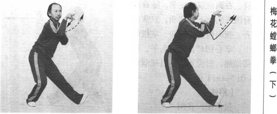 2 梅 花 螳 螂 拳下梅 花 螳 螂 拳下图 5-1-11图 5-1-11.左脚向前进一步,腿 成左踏基步,随跟沉腰、探 身、吞胸;双钩变掌,随着探 身沉腰向前下方摆动,双掌并 齐,腕向拇指边弯曲,掌指朝 上,掌心相对,高与头平,肘 部微屈,肘尖朝下;目视双掌 (图 5-1-11 )。