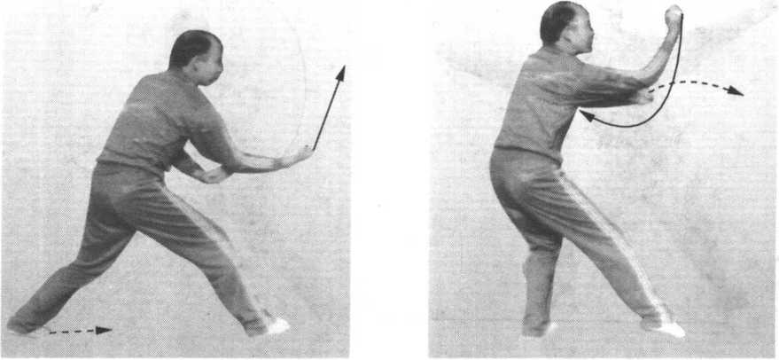 方抬手招架,我双手顺势后叫他招架之手。如对方逃脱后退, 我进步用左脚尖钩住他的踝部,用右拳圈打他头部。