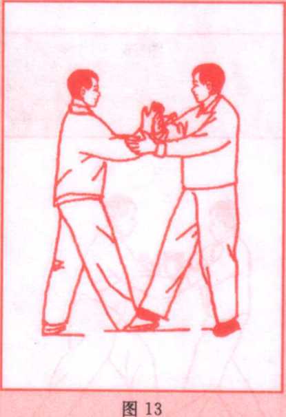 预备姿势:双方右手“搭手”后,各以左掌抚于对方右肘。 (图 13)