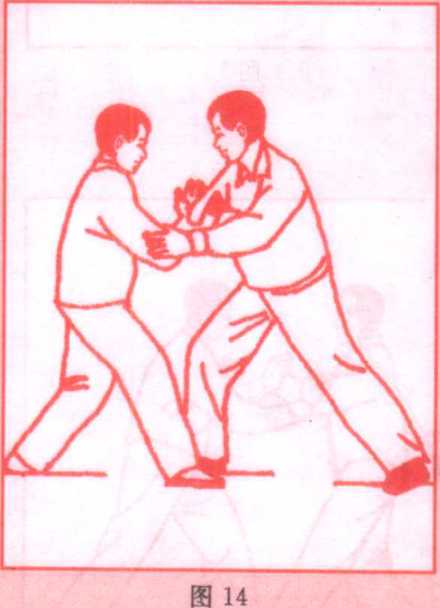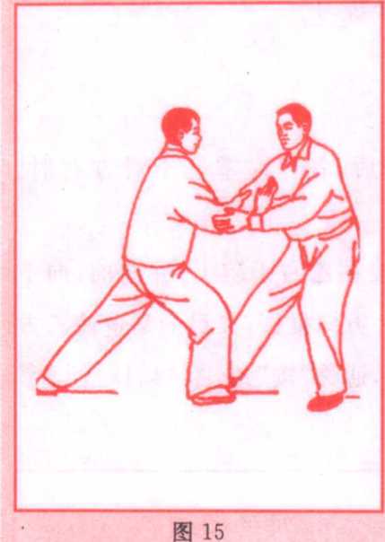 动作:(1)甲右手翻转,掌心按在乙右手腕上,并向前、向下 推按,同时左手在乙右肘部向同一方向推按,其目的是迫使乙方 右臂贴于他自己的胸前不得活动,通称“按”劲(图14、15)。
