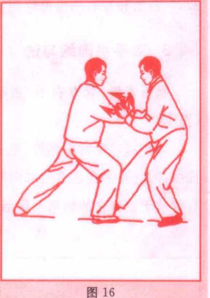 乙右臂刚用搠劲接承甲按劲,左手在甲右肘部顺势渐向后 弓I,左腿微屈,重心后移,上体微微含胸,同时身体右转,并用右 臂将甲方来劲向右弓I,使甲方按劲落空,通称“化”劲。(图16)