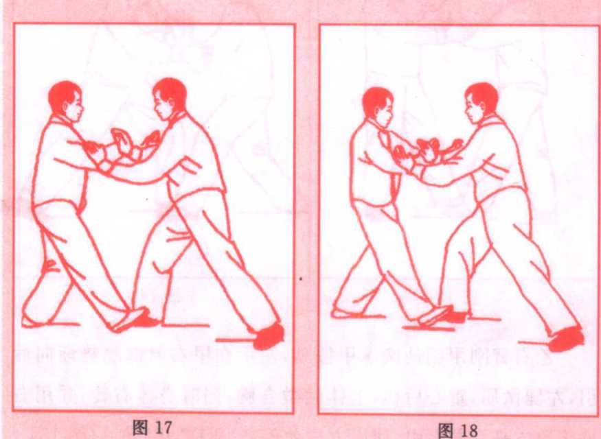(2)承上势。乙随即翻转右掌,掌心按在甲右手腕上,同时 两掌微向前,向下按,其目的和动作,与甲用按肘时相同。(图 17.18)