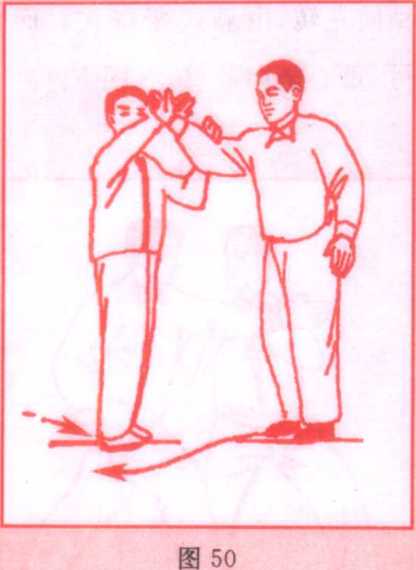 动作:(1)甲翻转右手虚握乙之右手腕,左手腕部抚在乙的 右肘上。同时左脚掌为轴脚跟外转,右脚随之收回半步,靠左脚 的内侧,身体也随即半面向右转,开始做捋式。乙趁甲收回右脚 开始做捋式时,左脚立即跟进半步,靠拢右脚,同时重心稍向前。 (图 50)