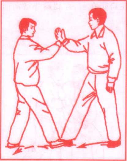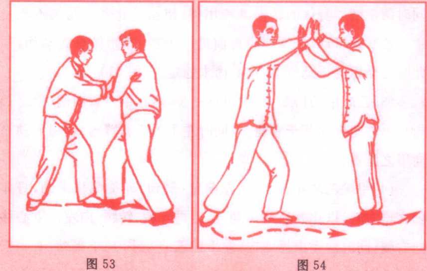(4)甲顺乙之靠势,先用左前臂(肘劲)外旋截住来劲,身体 随之略右转,以化开乙的靠劲,然后再含胸、转腰(向左),重心移 向右腿,同时两手由捋变按(左手按乙的左手,向下采劲,右手按 乙的左肘部),左脚提起抢进一步,落于乙右脚的内侧。(图53)