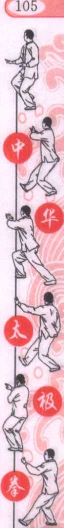 下抽出抚于甲之左肘;同时右脚收回半步,落在左脚内侧,身体 稍向左转,由靠式变捋式。而甲左脚仍在前,左腿顺势微向前 弓,重心微向前移。(图54)