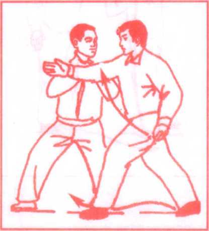 (7)甲左脚顺势再进一步,落在乙右脚内侧(乙的裆内),重 心略向前落于左腿上,同时右手附于左臂内侧,用肩劲靠向乙这 胸前。(图56)