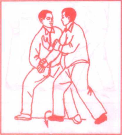 (3)乙顺甲的捋劲,右脚再进一步,落在甲左脚内侧(甲之裆 内),重心略向前落于右腿上,同时左手附于右臂内侧,用肩劲靠 向甲之胸前。(图52)