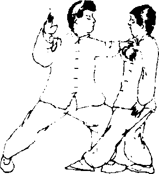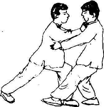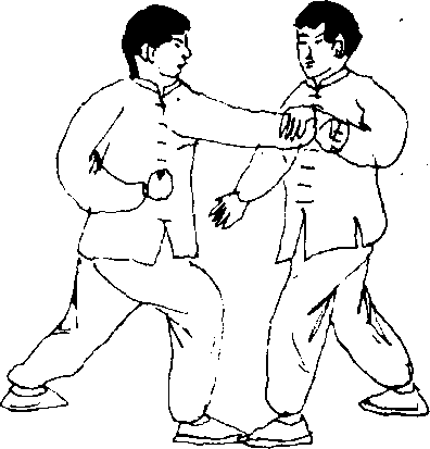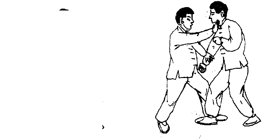 要 点:堵截敌手要在敌出击之前,堵截推手要将敌右臂 固于胸前,而无动弹的余地,右手推击敌胸要快猛,左手以助