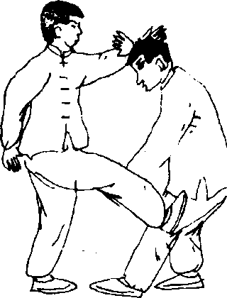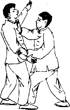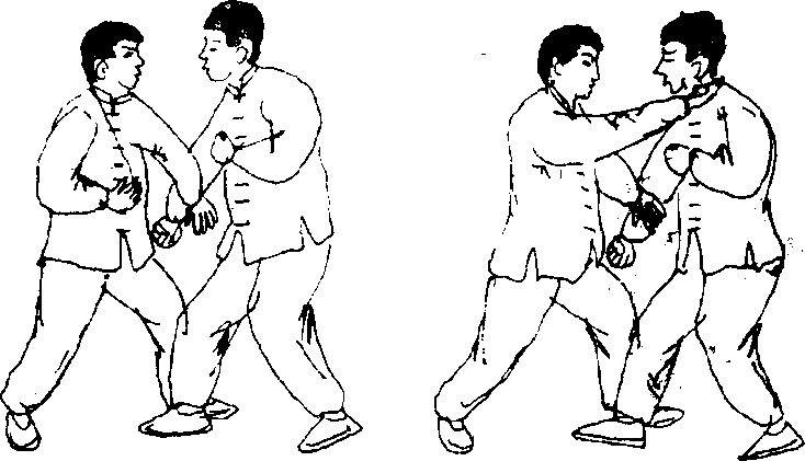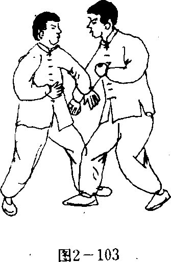 2-103)。当敌右臂被搂向前倾时;我速用右掌向敌胸部猛力 推击(图2—104),使敌胸部受伤。