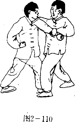 (图2-109),防开敌左拳的攻击。当敌左臂被领有前倾感时, 必用力后挣抗;我趁机用右掌向前、向左横拍敌头左侧(图 2—110),使敌头部受伤。