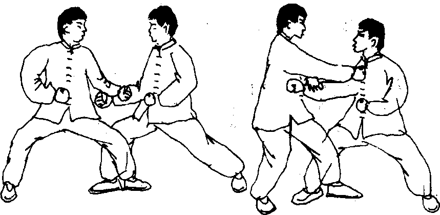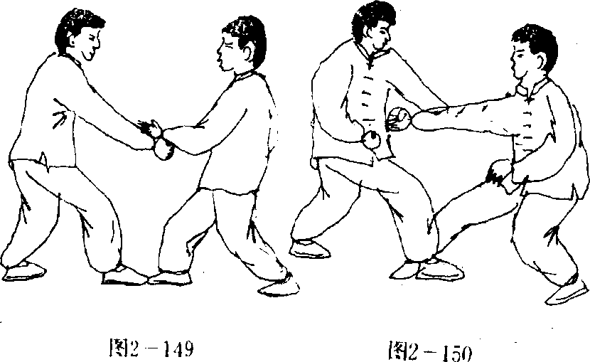 设与敌对面而立,我左脚前上一步,同时用左掌向敌徇前 猛推;敌速用右掌向上、向右横拍防(图2—153)。这时我左掌 速改变力向,向前、向下猛推敌腹;敌右手随之向下、向外搂我 左掌;我趁其防下之机,速出右拳,向敌胸部猛力击打(图2一
