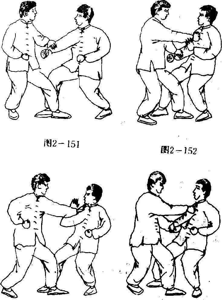 设敌右脚前上一步成为右弓步,同时用右拳向我腹部击 打而来;我左脚前上步,同时用左手向下,向外按敌右冲拳(图 当敌右拳被按,有前倾感时;我上体左转,同时用右 拳向敌胸部猛击(图2—152),使敌胸伤或死亡。