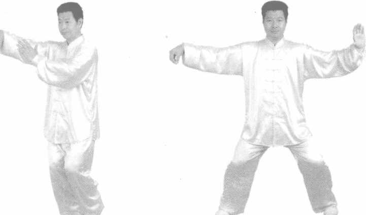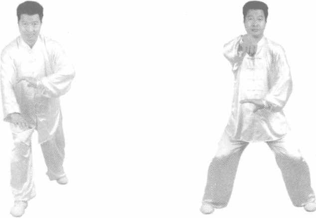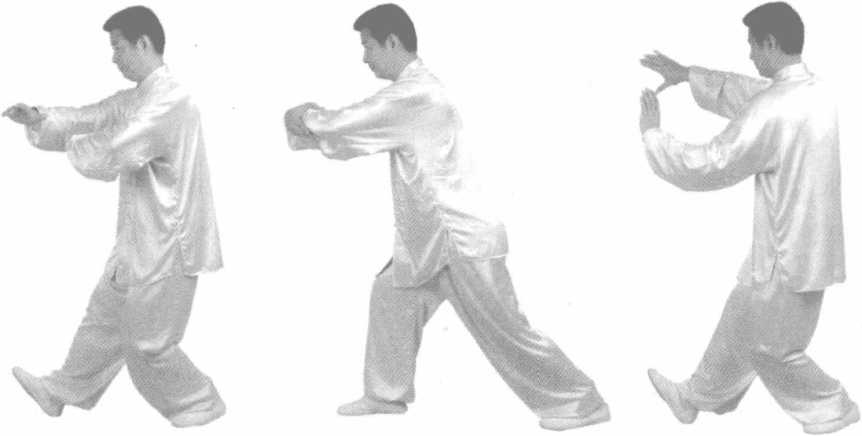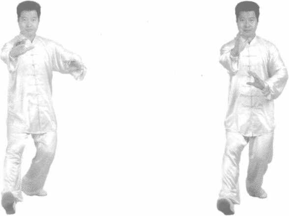 要领:前手运动时,后手须用通臂劲以助之,略含自上下击之意。而左右 两足须相随一致,后肩与前肩成水平勿上耸。此式为四肢及背部之运动。