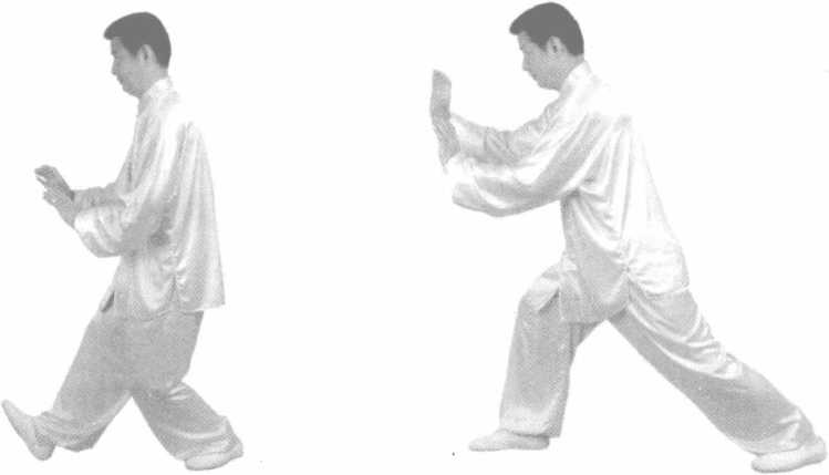 要领:前按时,手与步伐应一起向前,用力时以掌根向上挑。