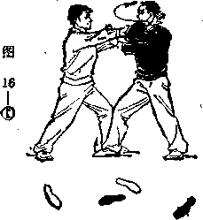 〗?在甲左拳将击到头部时, 乙微向右转腰,重心略向后移 (重心在两腿中间> 右臂捆住 甲左手不丢同时左手由左后方 边外旋边向下、向前、向上划孤, 手心向经自己右肘下穿于甲 右腕内侧(图16①〉。