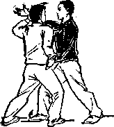 上动不擰,左脚落 实,右脚上步踏入乙裆内, 右隨屈膝,重心前移成右弓 步,双手内旋鉬转,拿住乙 的两腕,左手上撕,右手下 捋,向左转腰微蹲,用右肩 靠击乙的胸部。此时甲面向 东偏北,乙面向西(图51