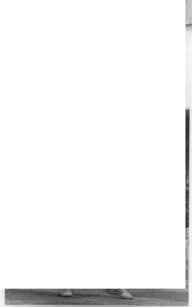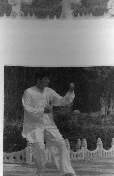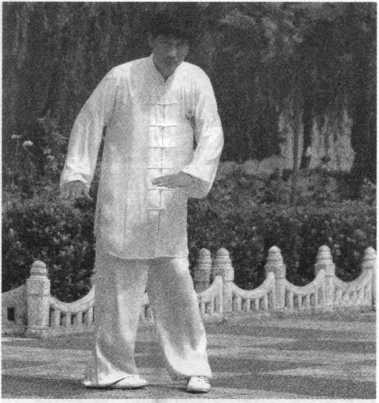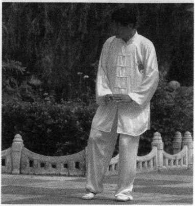 左脚下落重心左移,身向左 转,同时右脚向左上扫。(里合腿) 两手左右分开,右脚前落。并内扣, 左脚向后扫,两手左右展开,转身 再上右脚向左扫(里合腿)(图3-46 至3-52示)。